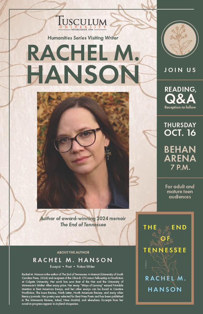 Rachel M. Hanson is the author of The End of Tennessee: A Memoir (University of South Carolina Press, 2024) and recipient of the Olive B. O’Connor Fellowship in Nonfiction at Colgate University. Her work has won Best of the Net and the University of Minnesota’s Walter Allen essay prize. Her essay “Ways of Leaving” earned Notable Mention in Best American Essays, and her other essays can be found in Creative Nonfiction, The Iowa Review, Ninth Letter, North American Review, and many other literary journals. Her poetry was selected for Best New Poets and has been published in The Minnesota Review, Juked, New Madrid, and elsewhere. Excerpts from her novel-in-progress appear in Joyland Magazine.
