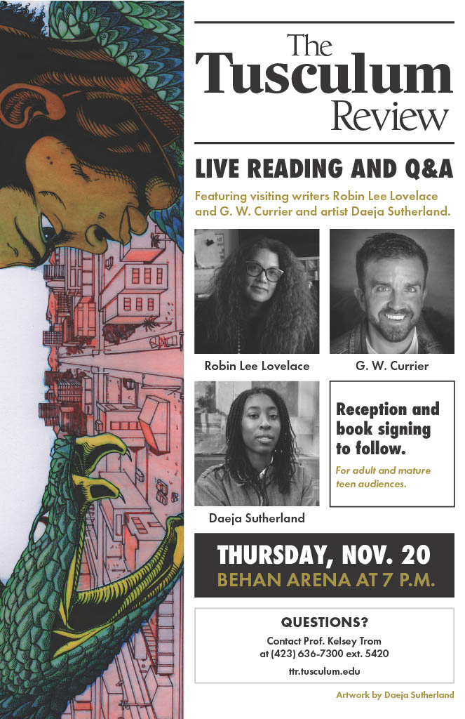 The Tusculum Review is pleased to host visiting writers Robin Lee Lovelace, winner of The Tusculum Review 2025 Fiction Chapbook Prize for her story “Snakebite,” and G. W. Currier, author of “Football Lessons for Life at the End of the World,” for the launch of Volume 21. They’ll be introduced by student editors and read from their work, then be joined by Daeja Sutherland, illustrator of “Snakebite,” to take questions and sign books on Thursday, November 20 at 7 pm in the Behan Arena. Reception to follow.
